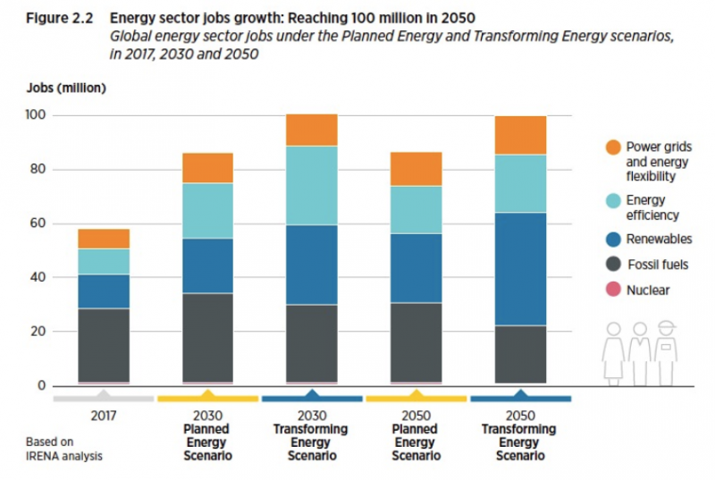 《展望》中揭示,盡管深入脫碳需要的能源投資總額高達 130 萬億美元,但其帶來的社會經(jīng)濟收益也非常豐厚。 從現(xiàn)在到 2050 年,與目前的能源系統(tǒng)相比,能源系統(tǒng)轉(zhuǎn)型可以刺激全球 GDP 累計增加 98 萬億美元。 可再生能源相關工作崗位將增至約四倍, 達到 4,200 萬個,能源效率相關工作崗位增加到 2,100 萬個,系統(tǒng)靈活性相關工作崗位 增加到 1,500 萬個。