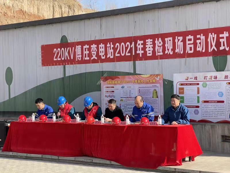 2021年3月23日上午9時,領(lǐng)航新能源有限公司黨支部書記、董事長趙立新、總經(jīng)理李勃燾同聚源電力實業(yè)公司總工郝利、聚源電力實業(yè)公司運(yùn)檢分公司總經(jīng)理劉雪軒、聚源電力實業(yè)公司運(yùn)檢分公司總經(jīng)理王燕鑫、聚源電力實業(yè)公司運(yùn)檢分公司技術(shù)專責(zé)李志孝,在傅莊進(jìn)行“2021年春檢現(xiàn)場啟動儀式”做動員講話。