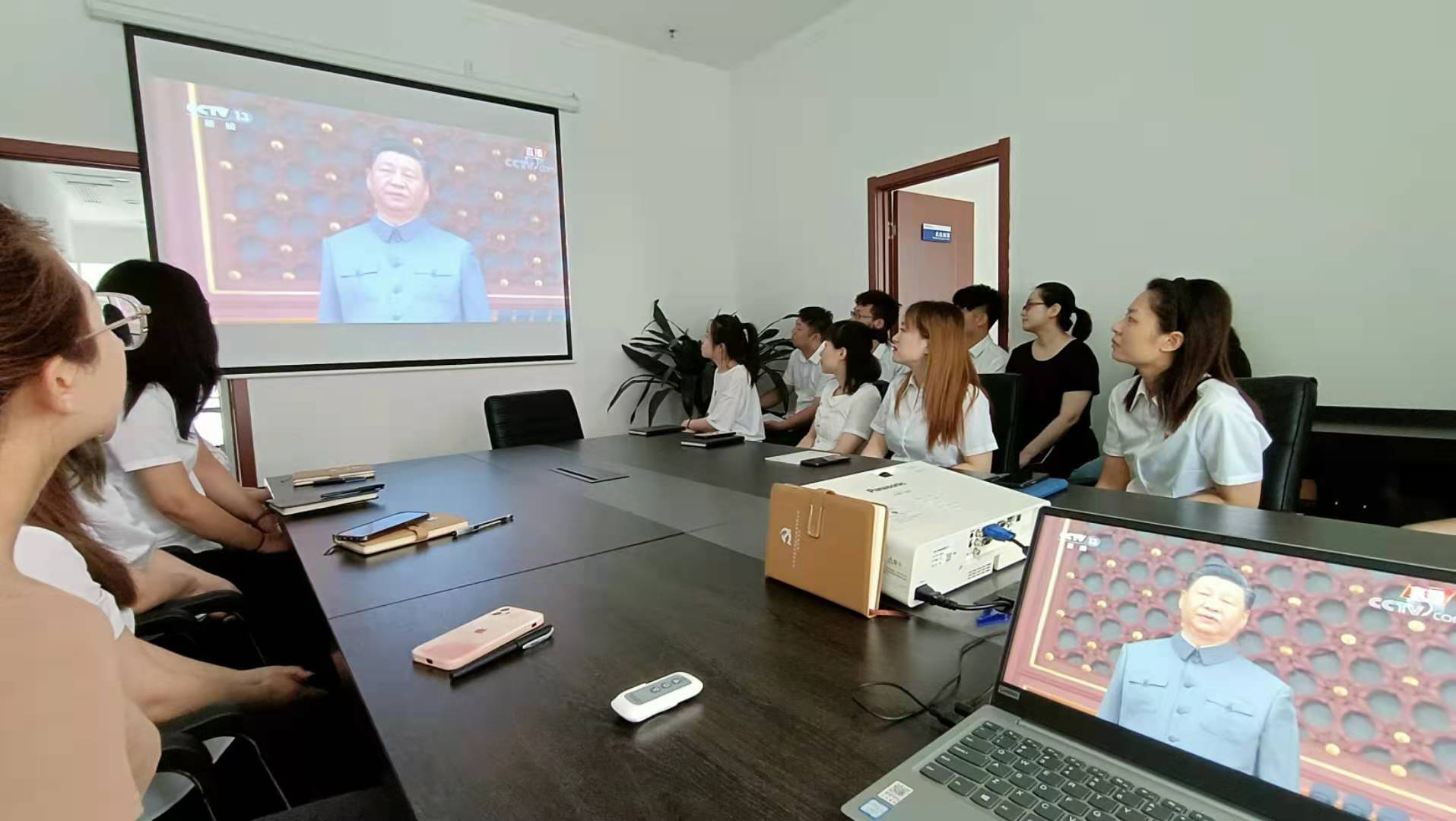 通過大屏幕,看到習(xí)近平同黨和國(guó)家領(lǐng)導(dǎo)人登上天安門城樓主席臺(tái),看到天安門廣場(chǎng)人頭攢動(dòng)時(shí),大家目不轉(zhuǎn)睛、聚精會(huì)神、認(rèn)真收看。電視直播期間,認(rèn)真聆聽習(xí)近平總書記的重要講話,邊看邊記筆記,總書記振奮人心的講話,會(huì)議室不時(shí)響起掌聲。一小時(shí)四十分鐘的直播,大家始終沉浸在熱烈莊重、恢宏磅礴的慶祝氛圍之中。大家紛紛認(rèn)為,百年恰是風(fēng)華正茂,未來仍需風(fēng)